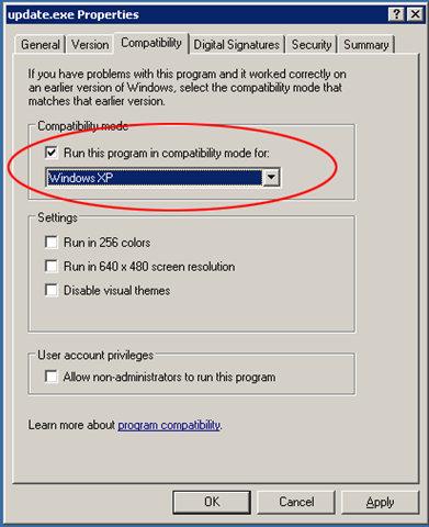 - Click on the Compatibility tab, check the box next to "Run this program in compatibility mode" and select "Windows XP". Then click OK.