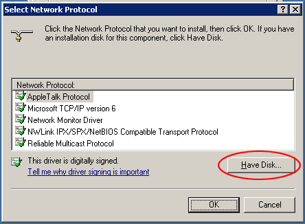 - On the Select Network Protocol window click Have Disk.