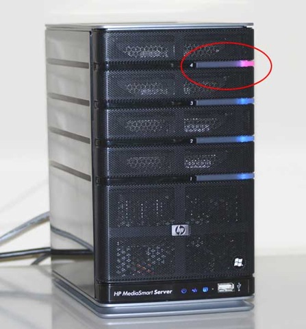 If you are using an HP EX470, the LED next to the drive that you can remove will turn purple (as shown below).