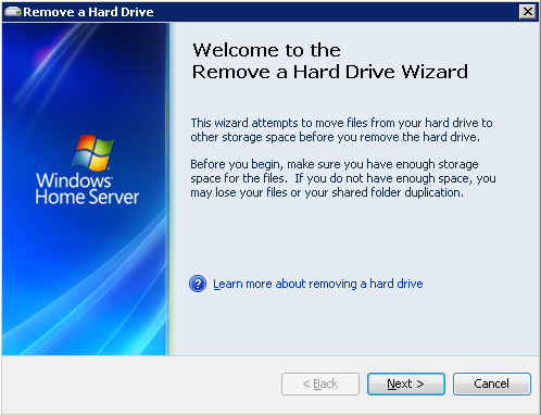 I wanted to remove a drive from my Windows Home Server, so I went to the console, selected the drive and clicked Remove. I was presented with this dialog: