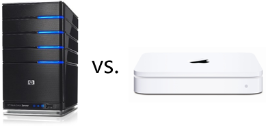 Let's see how the two compare, feature for feature, from the perspective of a Windows user. As a point of reference, I'm going to use the most popular Home Server, the HP EX470 MediaSmart Server.